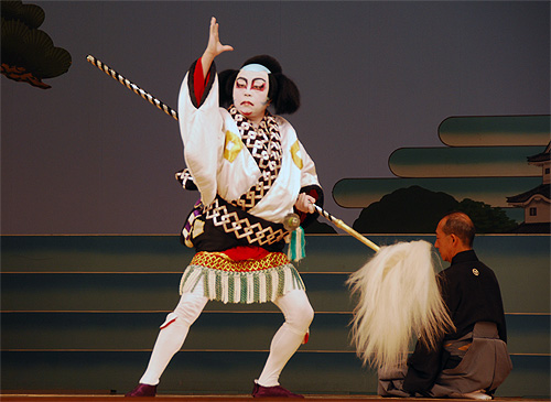 幕が開くと、おかめの面を付けた大原女が薪を頭に乗せて登場します。不格好な姿ながらもいじらしい女心を訴える振りがあり、綾竹(あやだけ)という房のついた紅白の棒を使ってリズミカルに踊ります。そしてその扮装から引き抜きをすると奴の姿になります。ここからが『国入奴』です。奴は毛槍を振り、大名行列のお国入りの様子を見せた後、ユーモアのある曲で手踊りをし、最後に再び槍を振って軽快に踊ります。